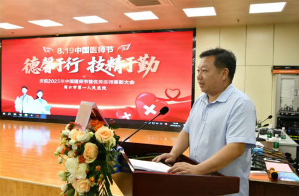 新秋如锦,暖意融融。8 月 15 日下午 3点,周口市第一人民医院门诊楼二楼会议室隆重举行2025 年“8.19”医师节表彰大会,医院领导班子、全体中层干部及获奖人员共同庆祝第八个中国医师节的到来。在温馨而庄重的氛围中,致敬医者担当,共话使命初心。会议由总支副书记、院长谢书源主持。